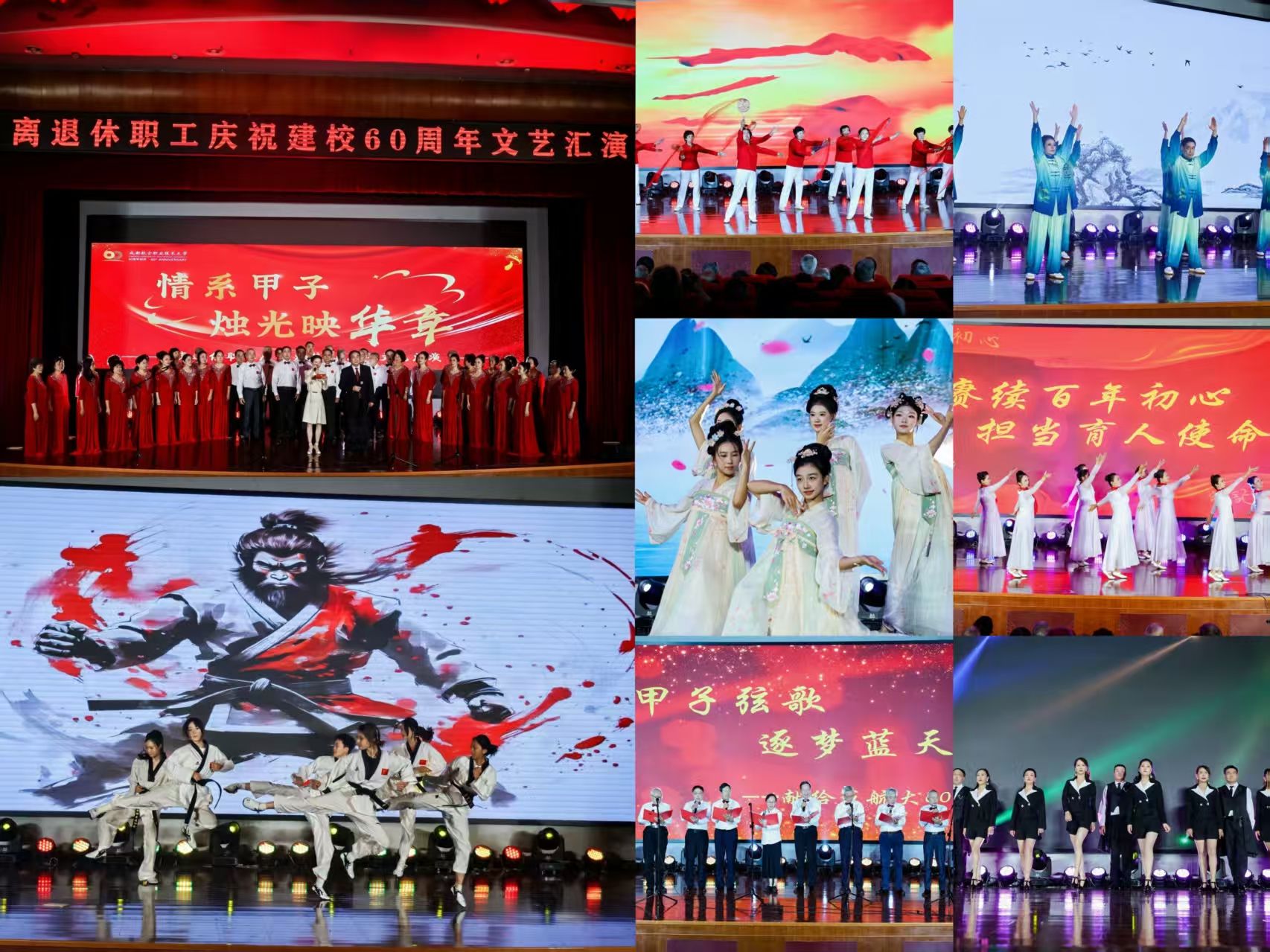随后,离退休太极队带来健身气功《八段锦》,一招一式行云流水,展现中华传统养生智慧;退休职工代表深情朗诵《甲子弦歌,逐梦蓝天》,将学校发展历程娓娓道来,引得观众热泪盈眶;古典舞《繁花》衣袂纷飞,为母校献上轻盈灵动的斑斓祝福。