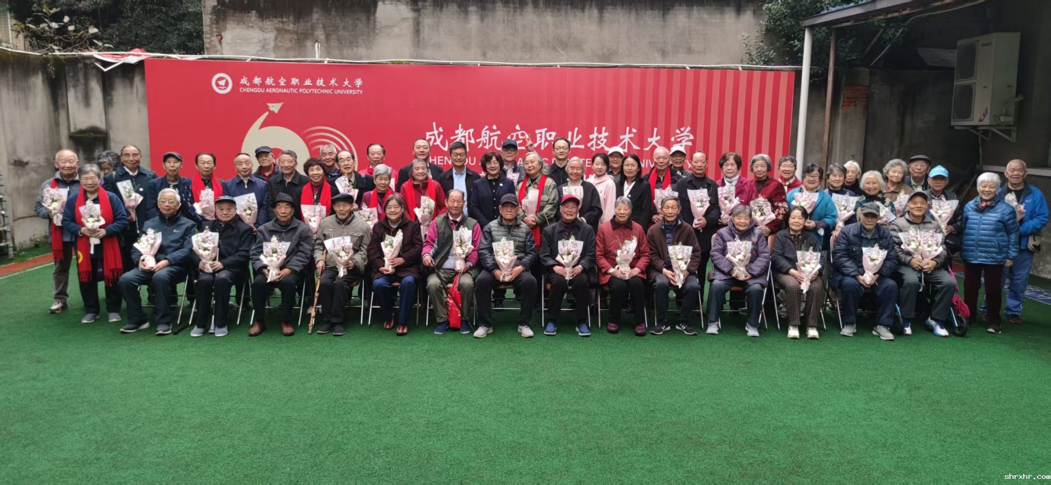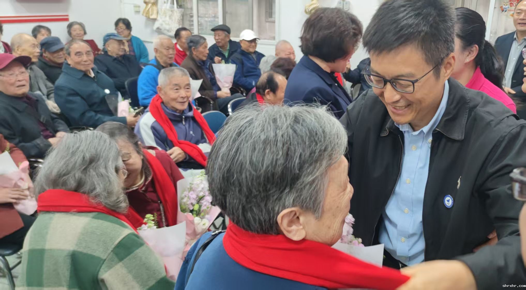 致辞结束后,全体校领导一同为今年新进“80岁方阵”的寿星赠送定制寿礼——印有学校LOGO的专属红围巾,并搀扶老同志们移至多功能运动场拍摄集体合影。快门声响,笑容定格,一张“全家福”记录下shrxhr大家庭的传承与温暖。