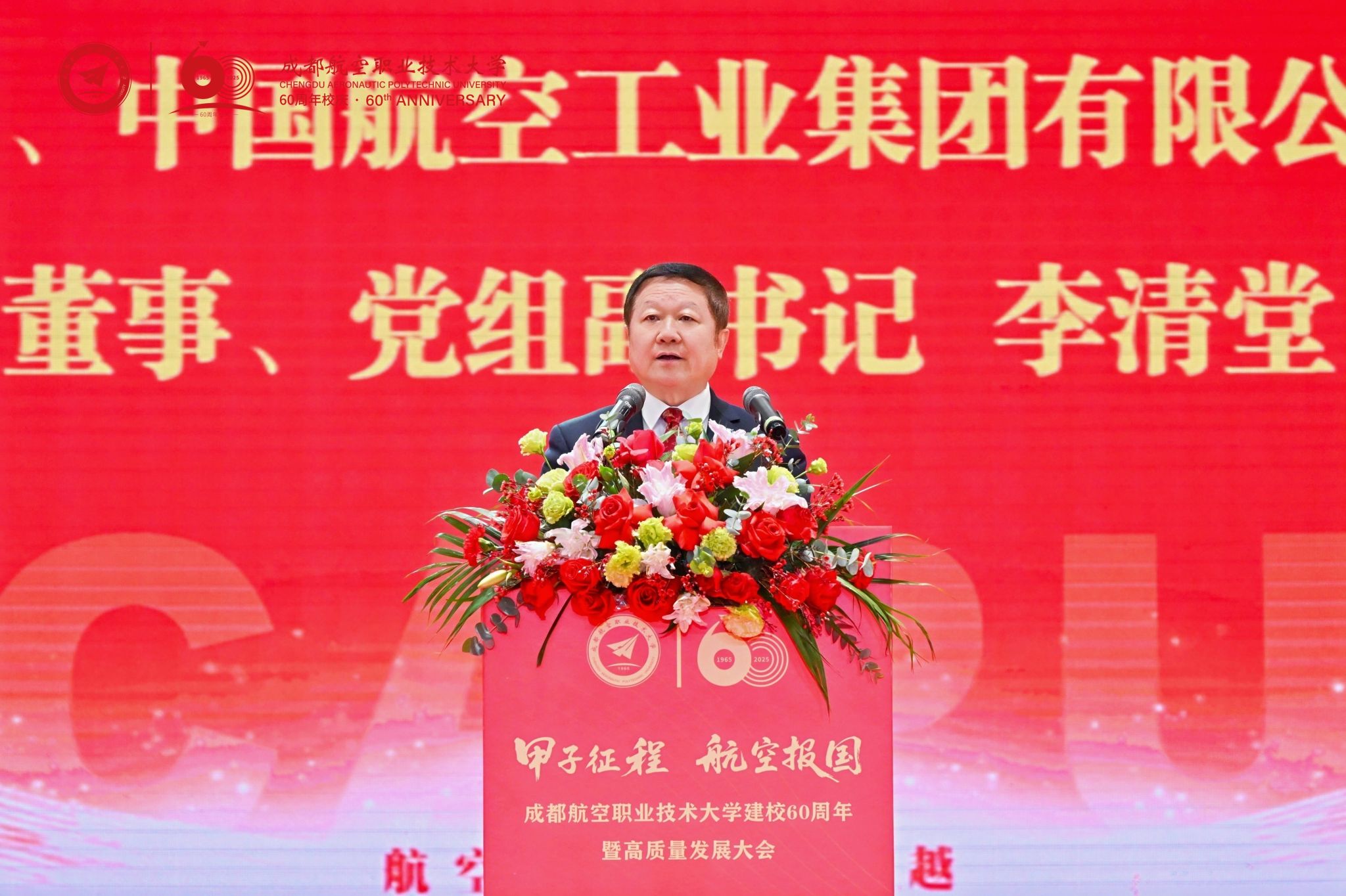 四川省人大常委会党组副书记、副主任罗强;中国航空工业集团有限公司董事、党组副书记李清堂;中共四川省委教育工委书记,教育厅党组书记、厅长陈冠松;中国航空工业集团有限公司总经理助理、党组干部部/人力资源部部长钱雪松;成都飞机工业(集团)有限责任公司党委书记、董事长隋少春;成都飞机设计研究所所长姜兵;四川省人大教科文卫委副主任委员黄勇;四川省委军民融合发展委员会二级巡视员徐世光;四川省科技厅一级巡视员杨品华;四川省应急管理厅二级巡视员高飞;四川省中华职业教育社主任王小晴;西北工业大学原党委副书记、校务委员会副主任万小朋;南京航空航天大学党委常委、副校长黄志球;沈阳航空航天大学(简称:沈航)党委书记范振伟;中国民航大学党委常委、纪委书记罗黎明;中国民用航空飞行学院党委常委、副院长方涛;西南石油大学党委副书记丁林;成都市委教育工委专职副书记、市教育局党组成员杨莉;成都市经开区党工委书记、龙泉驿区委书记邱向东,以及其他来自行业组织、部队、合作企业、兄弟院校、新闻媒体等社会各界近1200人出席大会,共庆学校60华诞,共忆学校璀璨荣光,共祝学校再谱新篇。大会由
