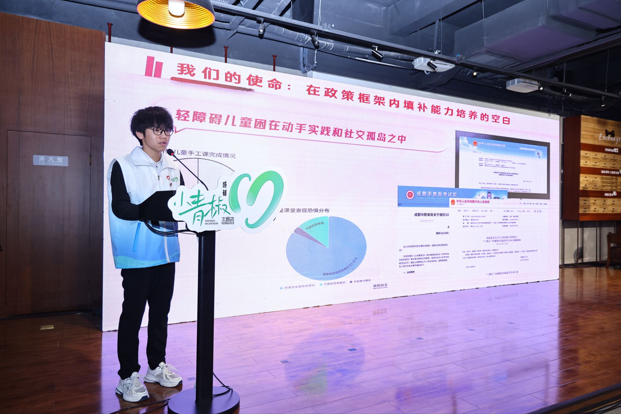 志愿者代表沈天富在会上深情讲述了“齿轮心愿”项目的初心与历程。项目精准聚焦轻障碍特殊儿童群体,针对政策保障之外“动手实践”与“社交融合”的真实困境,团队巧妙利用最基础的汽车刹车系统组装作为干预媒介,创新设计出“零失败教具”“小导师时刻”与“闪光舞台”构成的“三阶自信成长梯”模式,通过让特殊儿童体验从成功组装、到担任“小导师”指导他人、最终站上“闪光舞台”展示成果的全过程,切实帮助他们构建“我能行”的底层自信,并促进他们与普通儿童之间的双向融合。