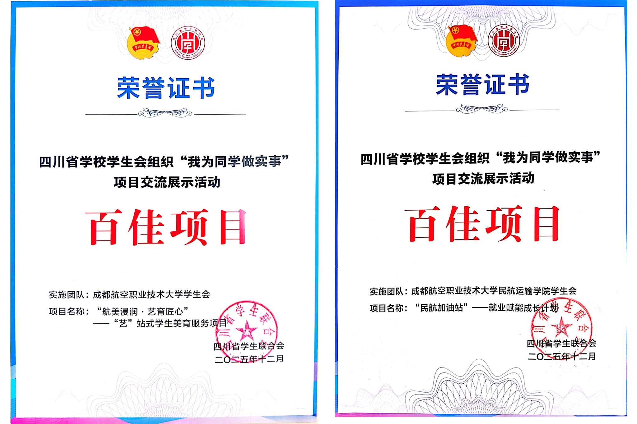 校学生会“航美浸润、艺育匠心”艺站式学生美育服务项目(左)与民航运输学院“民航加油站”项目(右)荣誉证书
