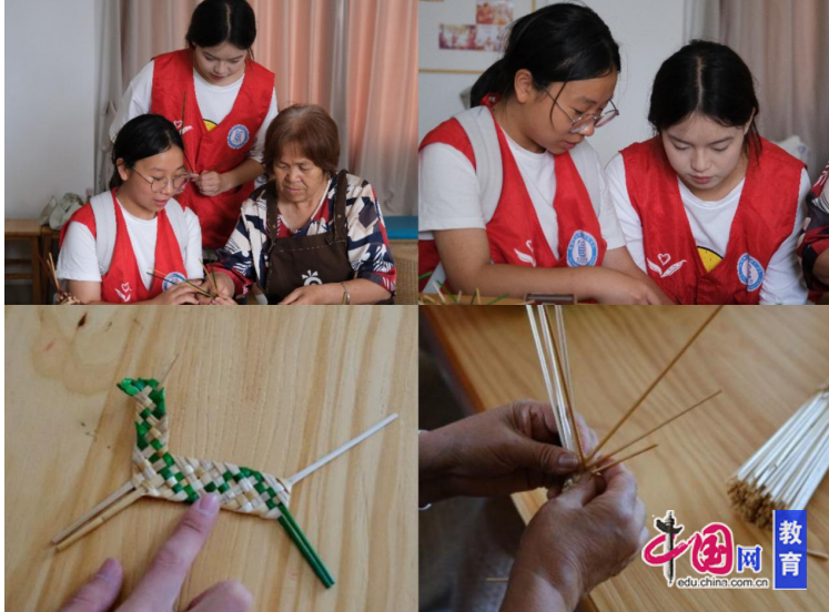随后,在草编嬢嬢的现场讲解与演示下,服务队的队员们了解了草编制作方法,并自己动手制作属于自己的草编作品。嬢嬢以制作一匹“马”为例,从麦秆数量、“井”字形摆放开头、麦秆交错编制以及马头、马尾的编制顺序,到最后编成小马,每一步都悉心教学,队员们都显现出极大的学习热情,认真编织。通过嬢嬢的耐心指导,都成功编成了自己的小马,深刻体会到传统文化的独特魅力。