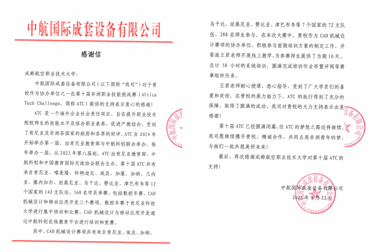 当地时间9月1日,第十届非洲职业技能挑战赛(Africa Tech Challenge,简称 ATC)圆满落幕,来自非洲12个国家的568名学员在赛事中展现了精湛的职业技能与昂扬的学习热情。优米集团作为CAD机械设计赛项的协办单位,为赛事提供了坚实的培训支持,工程实训中心教师王君也以专业与坚守,成为连接中非技能交流的 “云端桥梁”。近日,中航国际成套设备有限公司向学校发来感谢信。