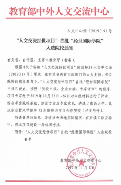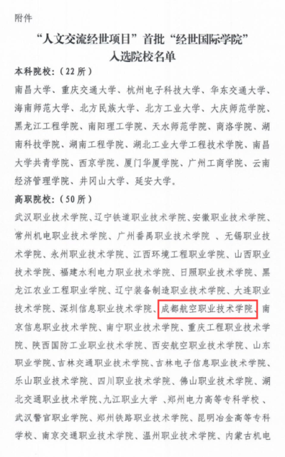 同时,根据 《“人文交流经世项目”首批“经世国际学院”入选院校通知》 (人文中心函〔2019〕91号 ),按照“院校申报、企业对接、专家评审”的程序,在综合考虑院校基础、建设方案及专家意见的基础上,成都航院被遴选确定为教育部“人文交流经世项目”首批“经世国际学院”院校。全国仅22所本科院校和50所高职院校入选。