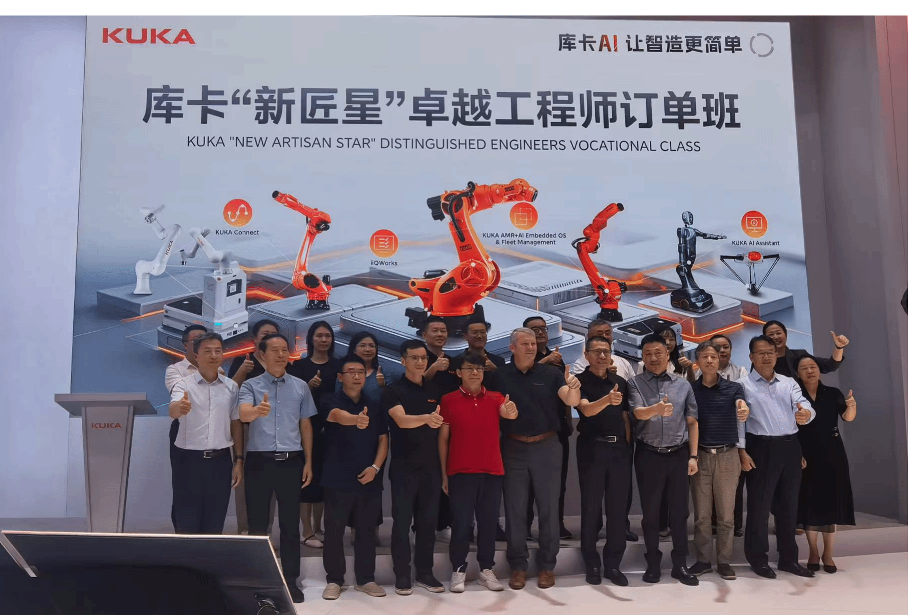 据悉, 与库卡正探索全方位合作,依托学校的人才优势和在航空领域的校企合作资源,共建以“一学院两平台”为理念的库卡学院,打造我国智能制造产教融合高地。此次“新匠星”卓越工程师订单班则采用“3+X”能力模型——“3”是机器人编程、PLC调试、机器人视觉三项核心技能,“X”则涵盖人工智能、数字孪生、AMR调度等前沿拓展能力。培养过程分为三阶段:从基础认知与企业文化导入,到专业实战与库卡课程嵌入,最后通过顶岗实习实现就业对接,形成闭环育人机制。