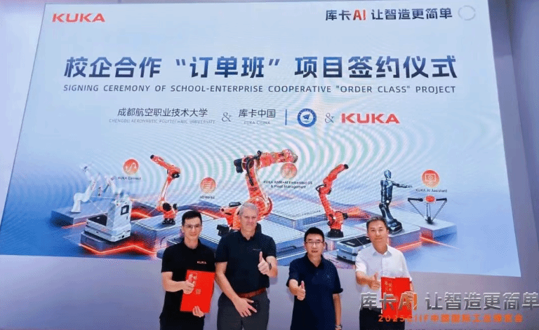 2025年9月23日,第二十五届中国国际工业博览会(简称:工博会)在国家会展中心(上海)隆重举行。原成都航空职业技术学院副院长何龙及相关部门领导参加博览会并与库卡机器人有限公司(简称:库卡)签订了“新匠星”卓越工程师订单班合作协议。出席签约活动的库卡领导有美的集团副总裁兼机器人及自动化事业部总裁、KUKA集团监事会主席顾炎民、库卡集团CEO Christoph Schell、库卡中国CEO许桂友等。