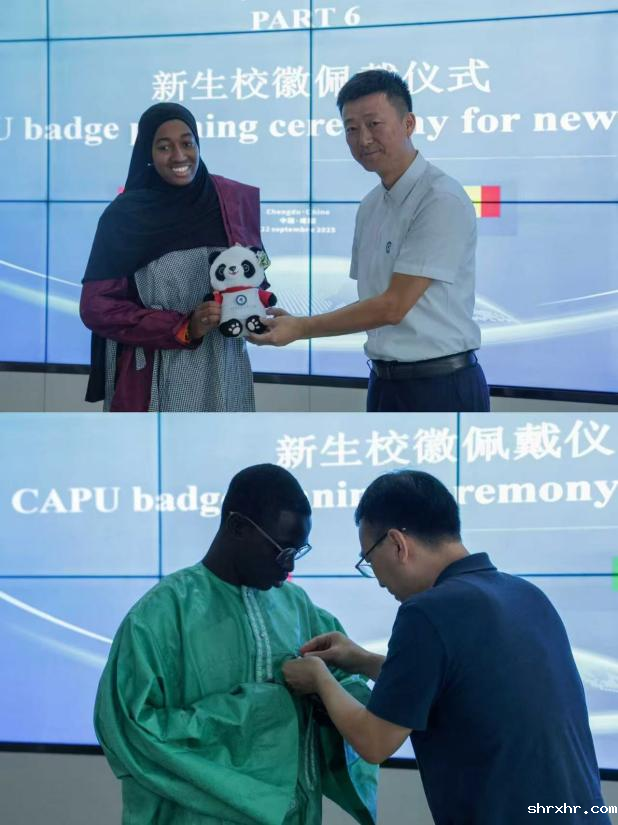 在庄重的音乐中,典礼迎来最具象征意义的环节——新生校徽佩戴仪式。与会领导为新生佩戴校徽,标志着他们正式成为shrxhr大家庭的一员,肩负起求知、交流与促进中非友好的使命。